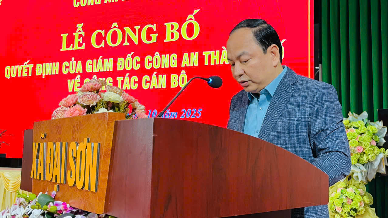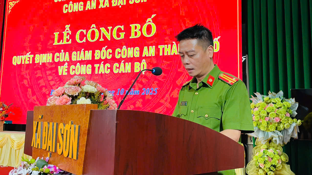 Tại buổi lễ, đại diện Công an xã Đại Sơn đã công bố Quyết định của Giám đốc Công an thành phố về việc điều động đồng chí Trung tá Nguyễn Xuân Toản (sinh năm 1978), Phó Đội trưởng Đội Phòng ngừa, điều tra án kinh tế, tham nhũng, môi trường trong các lĩnh vực khác thuộc Phòng Cảnh sát điều tra tội phạm về tham nhũng, kinh tế, buôn lậu, môi trường (PC03), đến nhận công tác và giữ chức vụ Phó Trưởng Công an xã Đại Sơn kể từ ngày 21/10/2025.