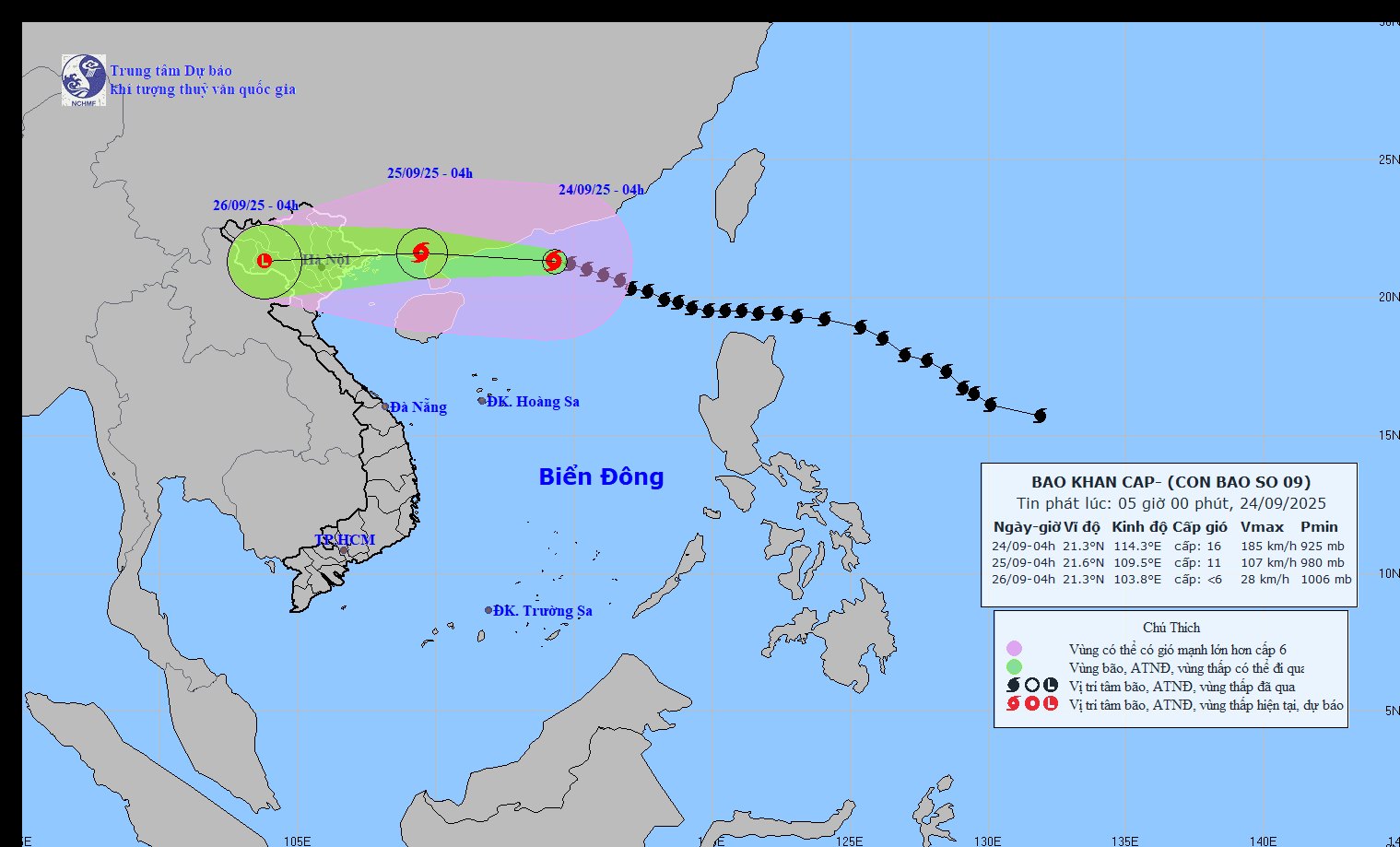 Theo dự báo của Trung tâm Khí tượng Thủy văn Quốc gia, siêu bão Ragasa với sức gió giật trên cấp 17, di chuyển theo hướng Tây Tây Bắc, có khả năng ảnh hưởng trực tiếp đến thành phố Hải Phòng trong những ngày tới. Đây là cơn bão có cường độ rất mạnh, phạm vi ảnh hưởng rộng, tiềm ẩn nguy cơ gây thiệt hại lớn về người và tài sản.