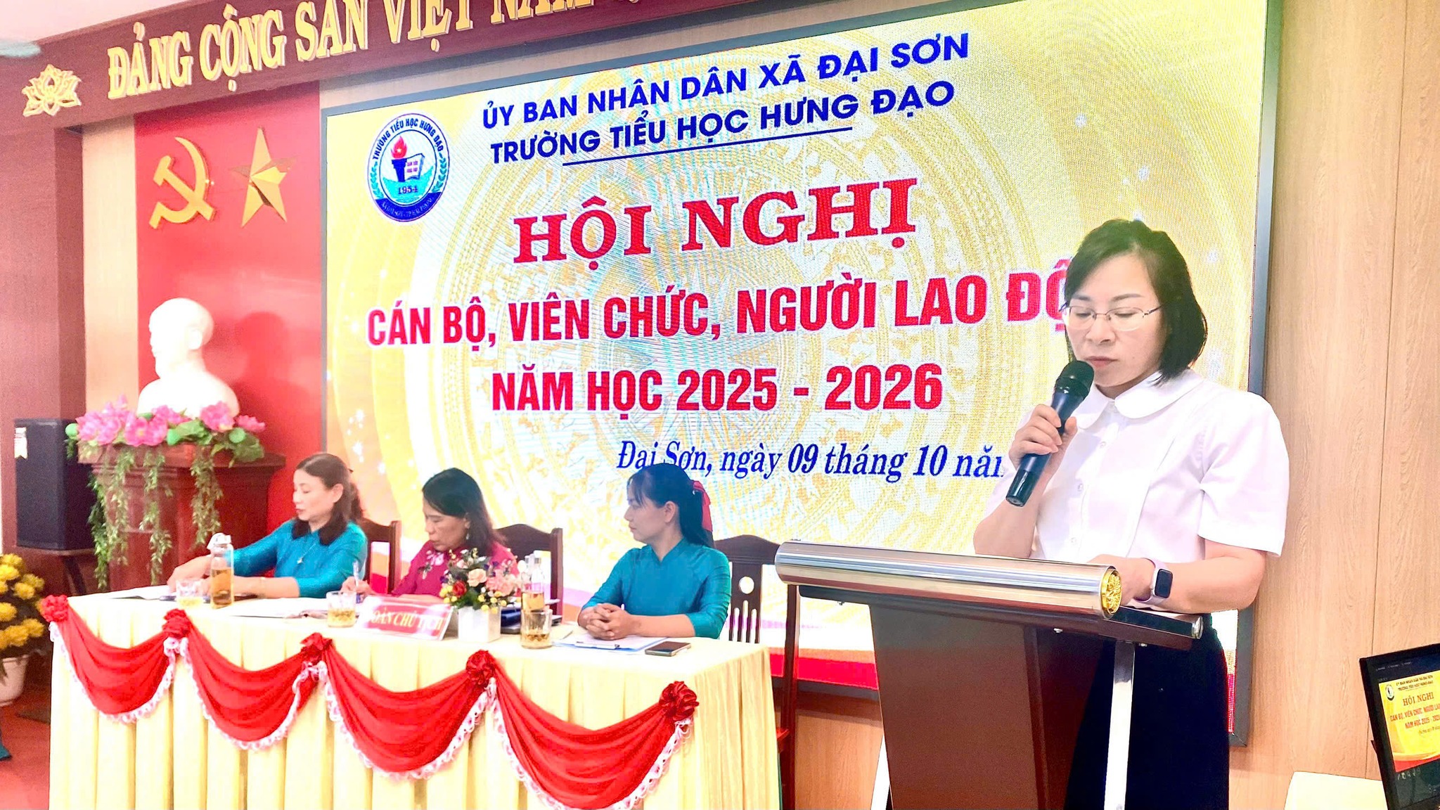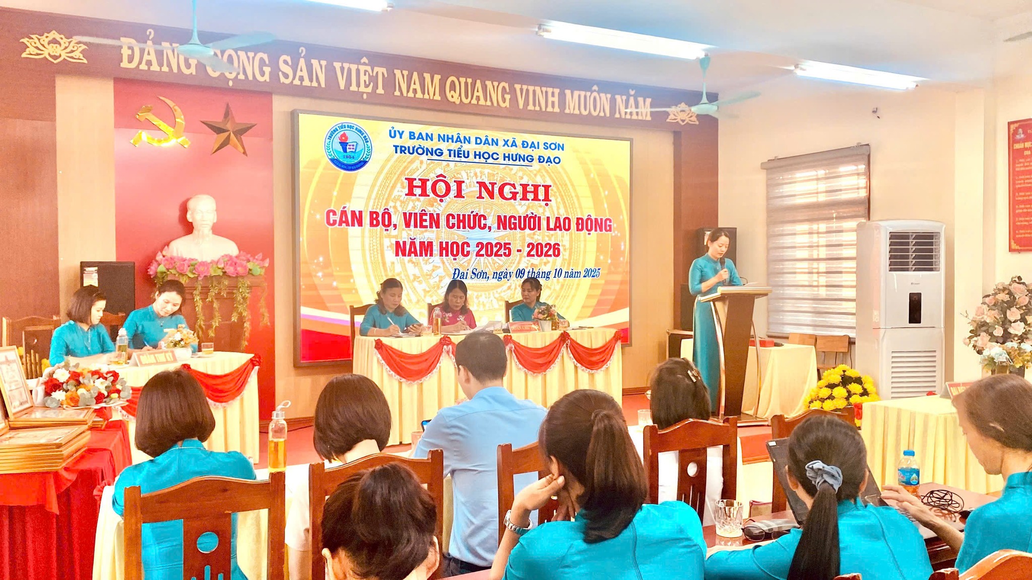 Chiều 9/10, Trường Tiểu học Hưng Đạo tổ chức Hội nghị cán bộ, viên chức, người lao động năm học 2025 – 2026. Hội nghị là diễn đàn dân chủ để mỗi cán bộ, giáo viên, nhân viên cùng nhìn lại những kết quả đạt được trong năm học qua, đồng thời thảo luận, thống nhất các giải pháp thực hiện thắng lợi nhiệm vụ năm học mới.