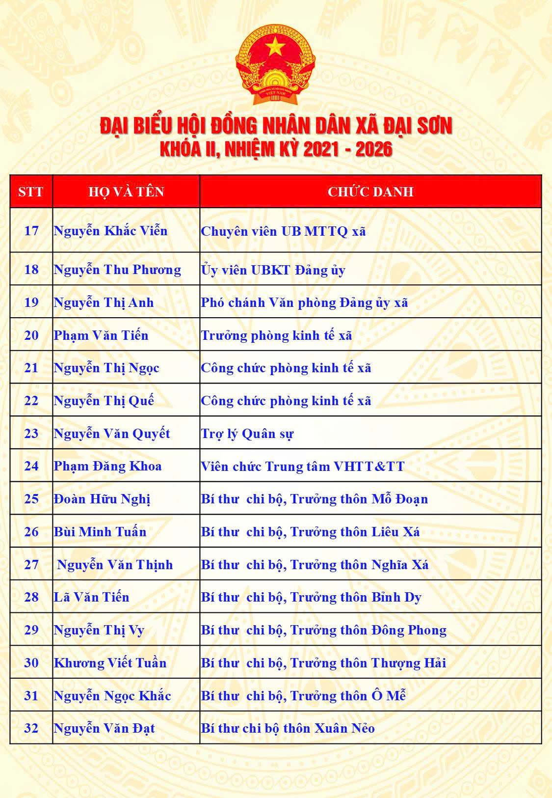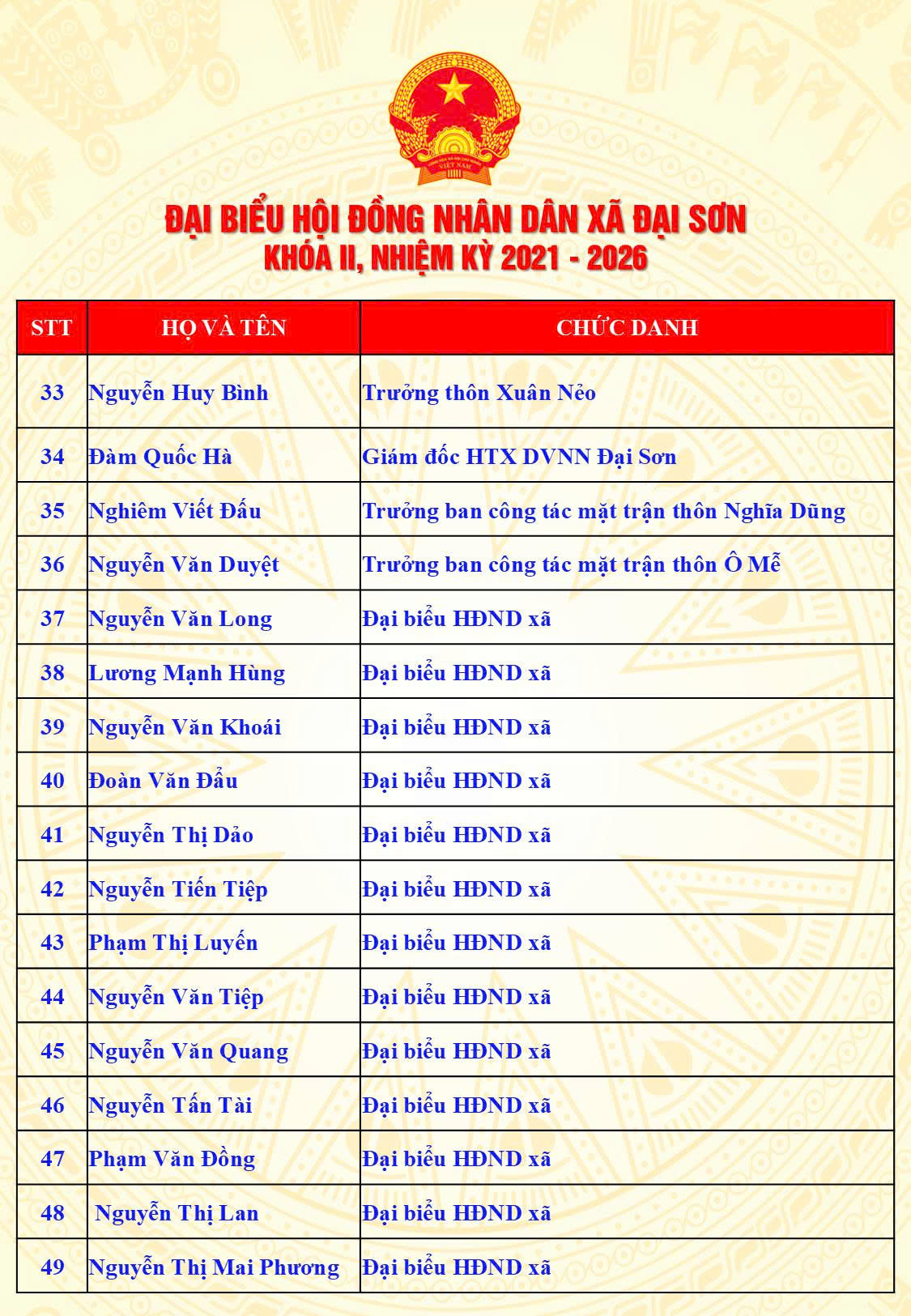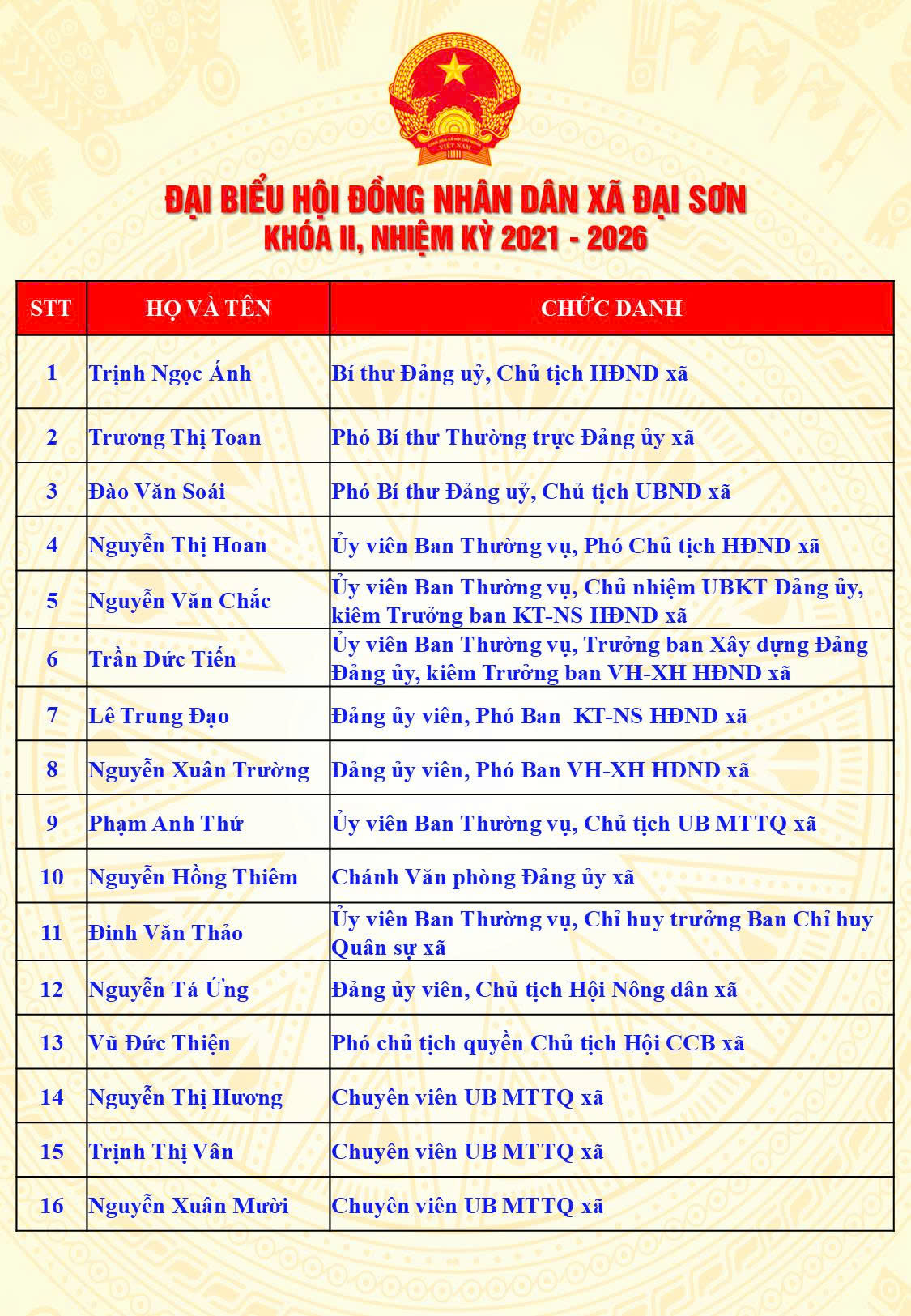 Danh sách Thường trực HĐND xã, các Ban HĐND xã và Đại biểu HĐND xã Đại Sơn Khóa II, nhiệm kỳ 2021 - 2026